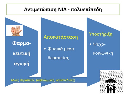 Χρησιμοποιούνται φάρμακα που αποσκοπούν στον έλεγχο και καταστολή της αυτοάνοσης φλεγμονής και όχι απλά στην αντιμετώπιση των συμπτωμάτων. Η έρευνα συνεχώς εξελίσσεται και σήμερα διαθέτουμε ειδικά και στοχευμένα φάρμακα που είναι κατάλληλα για τον αναπτυσσόμενο οργανισμό, τα οποία αναστέλλοντας την διατήρηση και εξέλιξη της φλεγμονής, αποτρέπουν την εγκατάσταση μόνιμων αλλοιώσεων που θα επηρέαζαν ανεπίστρεπτα τη σωματική λειτουργικότητα και ψυχοκοινωνική ευεξία. Παράλληλα, όταν υπάρχει προσβολή αρθρώσεων και γειτονικών δομών του μυοσκελετικού, εφαρμόζεται έγκαιρα και όπου χρειάζεται φυσικοθεραπεία και φυσικοθεραπευτική καθοδήγηση για εκτέλεση εξατομικευμένου ασκησιολογίου στο σπίτι από τον ασθενή. Η φυσικοθεραπευτική υποστήριξη αποσκοπεί στη διατήρηση και αποκατάσταση του μυοσκελετικού συστήματος και επανένταξη στους φυσιολογικούς ρυθμούς της ζωής. Ο ασθενής επιστρέφει στην κατάλληλη για την περίπτωσή του σωματική δραστηριότητα και παροτρύνεται να συμμετέχει σε κατασκηνωτική ζωή όπου εκπαιδεύεται στην αυτοφροντίδα του σώματός του.